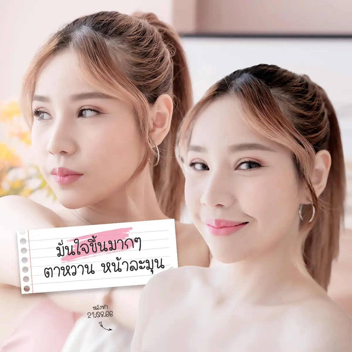 สำหรับแอล 2 เดือนตาสองชั้นก็เข้าที่มากๆแล้ว คนทักเยอะมากว่าหน้าไม่เศร้าตาไม่ตกเหมือนแต่ก่อน ดูดีขึ้นเยอะ ตั้งแต่ทำศัลยกรรมตาสองชั้นมาแอลมั่นใจในตัวเองขึ้นมากๆ สนุกกับการแต่งหน้ามากขึ้น เวลาไลฟ์วีเจก็กล้าจ้องกล้องจิกกล้องสุดๆเลยค่ะ คิดว่าการถ้าใครกำลังหาวิธีแก้ตาตกอยู่ สำหรับแอลวิธีทำตา2ชั้นช่วยแอลได้ค่ะ ยังไงลองเข้ามาปรึกษาและหาเทคนิคที่ถูกใจทุกคนดูนะคะ