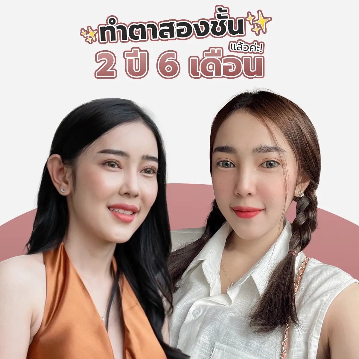 มีเพื่อนแบมคนนึงเห็นแบมทำตาสองชั้นที่นี่แล้วออกมาสวย สวยจนเพื่อนมาทำตามเลยนะคะ เขาบอกว่าหาคลินิกศัลยกรรมตาสองชั้นมานานแล้ว ดูหลายที่เหมือนกัน แล้วจังหวะบังเอิญนัดเจอกลุ่มเพื่อนเก่าพอดีเลยได้มาเจอแบม เขาชอบตา2ชั้นของแบมมาก มากจนตอนนี้มาเป็นคนไข้ที่คลินิกอีกคนแล้วค่ะ เพื่อนทำตาสองชั้นที่นี่ได้ 5 เดือนกว่าแล้ว ออกมาสวยเหมือนกันเลยรอยแผลเป็นไม่ต้องพูดค่ะ เนียบกริ๊บ แต่ของเพื่อนแบมจะเป็นชั้นตาที่ไม่สูงเท่าของแบมนะคะ เพราะว่าคุณหมอบอกว่ากระดูกเบ้าตาแคบทำสูงมากไม่ได้ สุดท้ายเพื่อนเชื่อคุณหมอทำออกมาสวยหวานเป็นธรรมชาติมากค่ะ จากผู้หญิง2คนที่หน้าตาธรรมดาๆ ตาชั้นเดียว พอได้มาศัลยกรรมตาสองชั้นแล้วก็เป็นผู้หญิงธรรมดาๆเหมือนเดิมนั้นล่ะค่ะ ที่เพิมเติมคือสวยขึ้น ตาหวานขึ้น แบบแพ๊คคู่