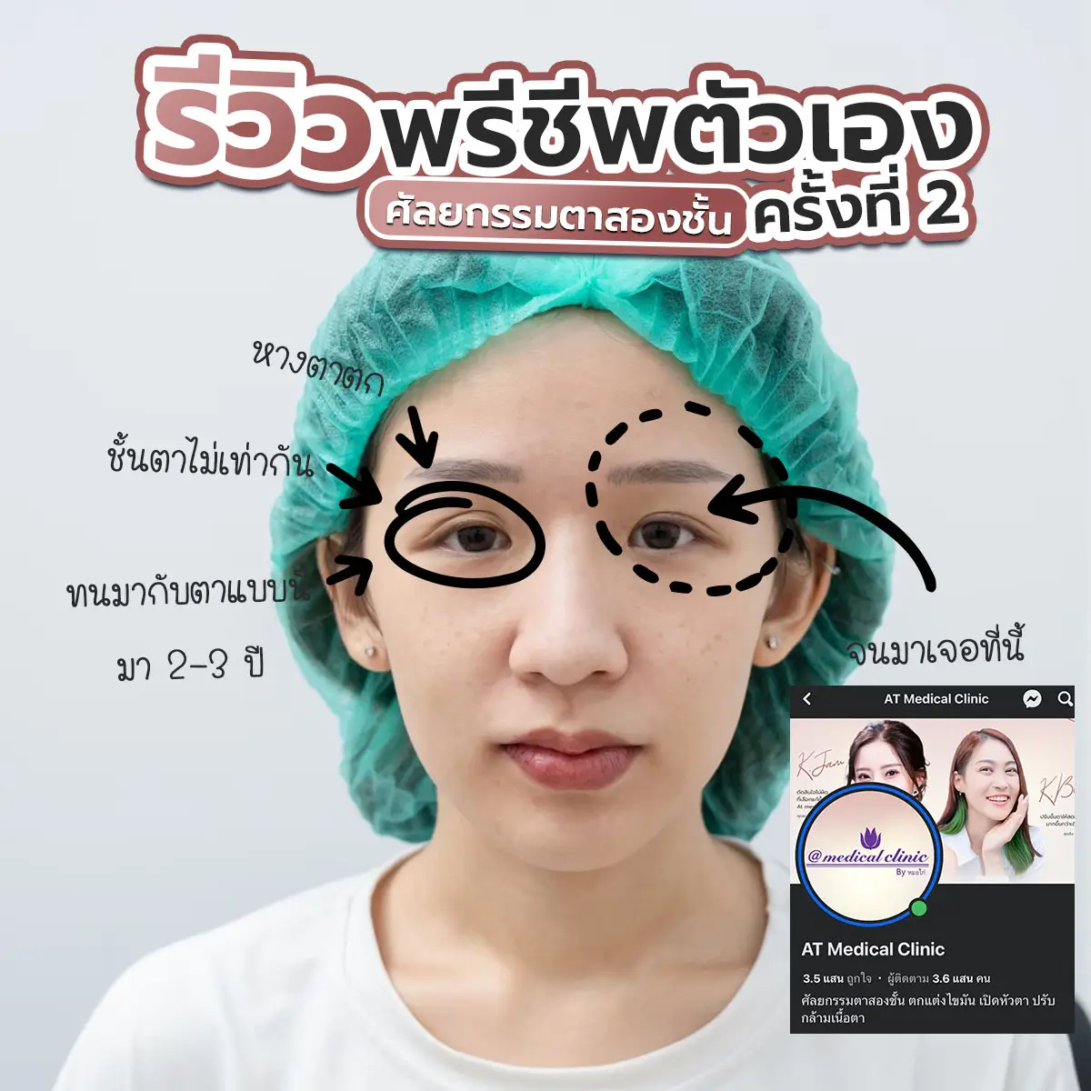 แรกๆว่าคิดไปเองแต่พอเริ่มมีคนทัก ทำให้เจินเริ่มไม่มั่นใจในตัวเอง และใช่เจินไม่มั่นใจในตัวเองเลย เจินต้องอยู่แบบนี้ 2- 3 ปี อะทุกคน นอยด์มาก เฟลมาก จนปรึกษาเพื่อนคนเดิม ซึ่งเพื่อนเชียร์ให้เจินแก้ตา เจินเลยลองหาคลีนิคอีกครั้ง จนมาเจอโฆษณาของ At Medical Clinic ของหมอไก่ ซึ่งเจินเองก็เข้าไปดูเคสรีวิว ศึกษาข้อมูลรอบนี้ค่อนข้างเยอะเพราะเจินผิดพลาดกับครั้งแรกมาแล้ว ไม่อยากมาพลาดกับครั้งที่สองอีก