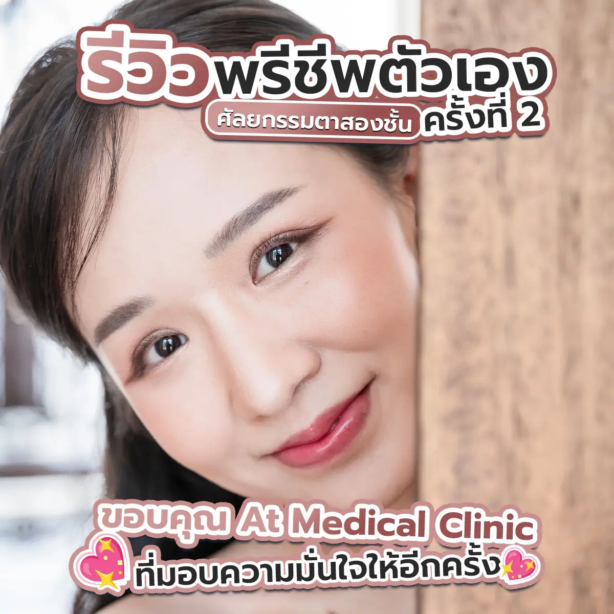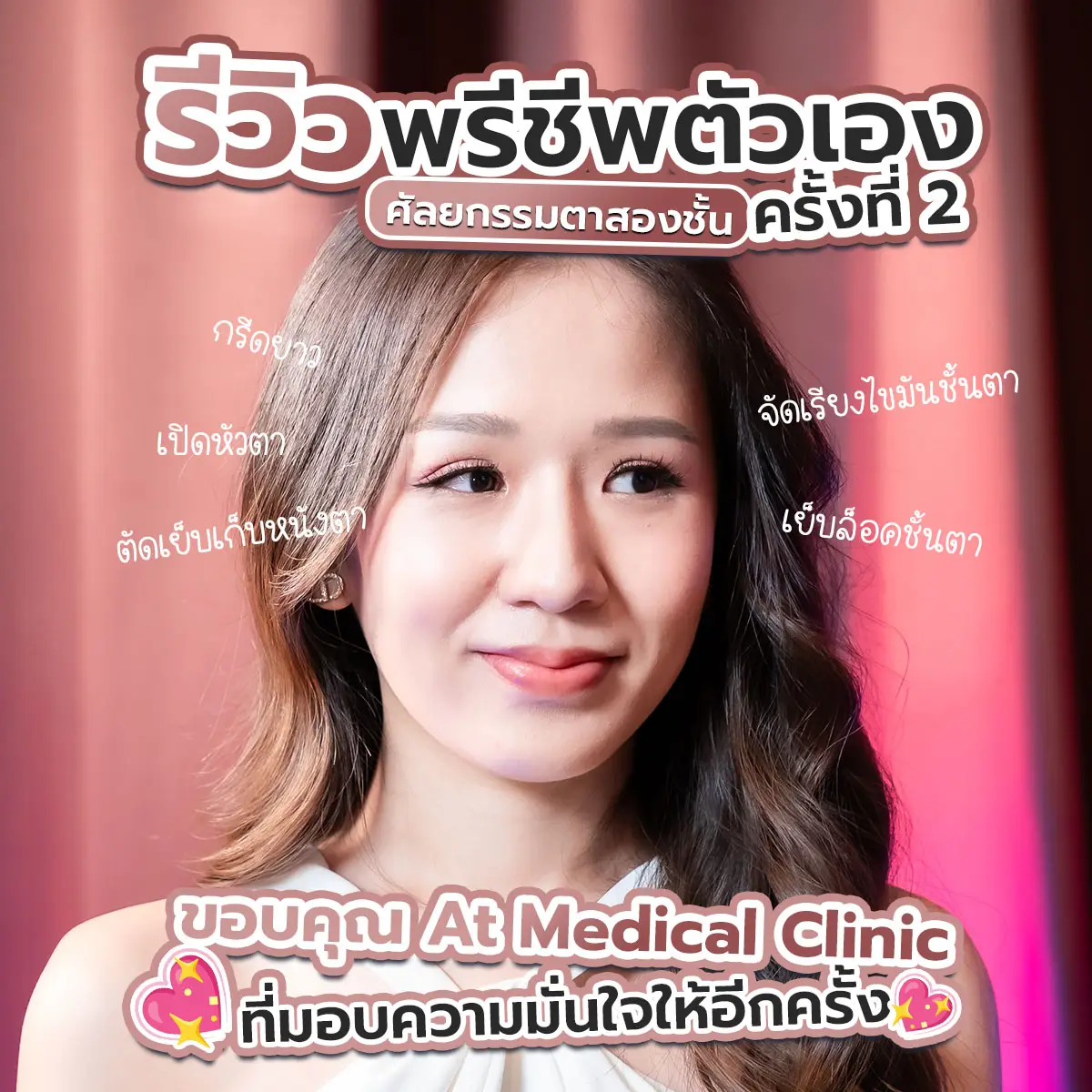 และคุณหมอแนะนำวิธีการดูแลตาหลังทำผ่าตัดด้วยนะคะ เช่น ช่วงแรกๆคือการกดตาเพื่อลดอาการบวมในช่วงแรกๆ การล้างแผล การดูแลหลังทำตาจนถึงวันที่ตัดไหม ซึ่งเจินรู้สึกว่า คุณหมอ ใส่ใจเจินทุกขั้นตอนจริงๆค่ะ ตอนนี้เจินทำตามาแล้วสามเดือน บอกเลยถูกใจ มั่นใจในตัวเองมากขึ้น จากที่มีคนทักว่าชั้นตาแปลก ตอนนี้กลายเป็นตาสวยจนหน้าเปลี่ยนไปเลยนะ ทำตาที่ไหน สวยขึ้นเยอะมาก บอกเลยว่าเจินภูมิใจมากยิ้มไม่หุบเลย และเจินต้องขอขอบคุณ มอไก่ At Medical Clinic ที่ทำให้เจินเหมือนได้ชีวิตใหม่อีกครั้ง เพราะดวงตาคู่นี้ทำให้เจินหน้าเปลี่ยนไปจริงๆค่ะ จากหน้าเป็นสาวหมวย ตอนนี้มีแต่คนชมว่าหน้าสวยละมุน ตาหวานฉ่ำมากๆเลย