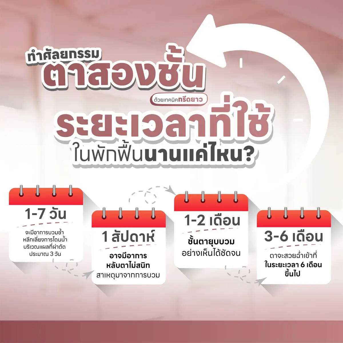 - 1 สัปดาห์: ชั้นตาเริ่มยุบ อาจมีอาการหลับตาไม่สนิท (หายเองเมื่อแผลยุบ)
