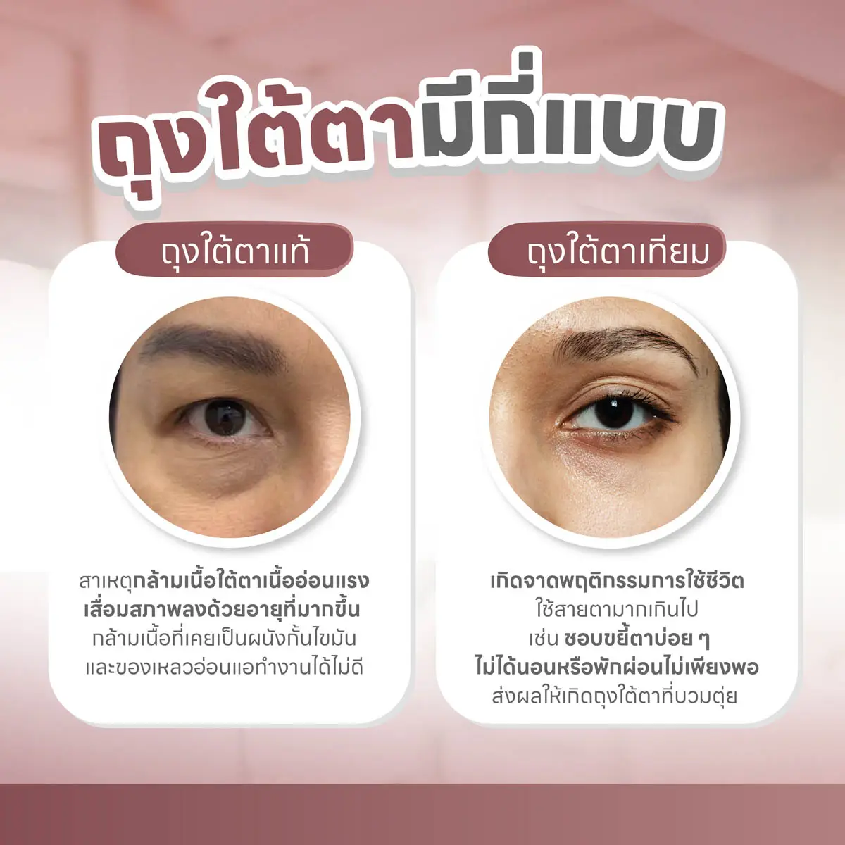 - ถุงใต้ตาแท้ คือ ลักษณะของผิวบริเวณใต้ตาหย่อนคล้อย จากสาเหตุกล้ามเนื้อใต้ตาเนื้ออ่อนแรงเสื่อมสภาพลงด้วยอายุที่มากขึ้น กล้ามเนื้อที่เคยเป็นผนังกั้นไขมันและของเหลวอ่อนแอทำงาได้ไม่ดี ไขมันและของเหลวจึงเคลื่อนที่ไหลลงมากองบริเวณด้านหน้าทำให้ถุงใต้ตาบวมนู่นขึ้น