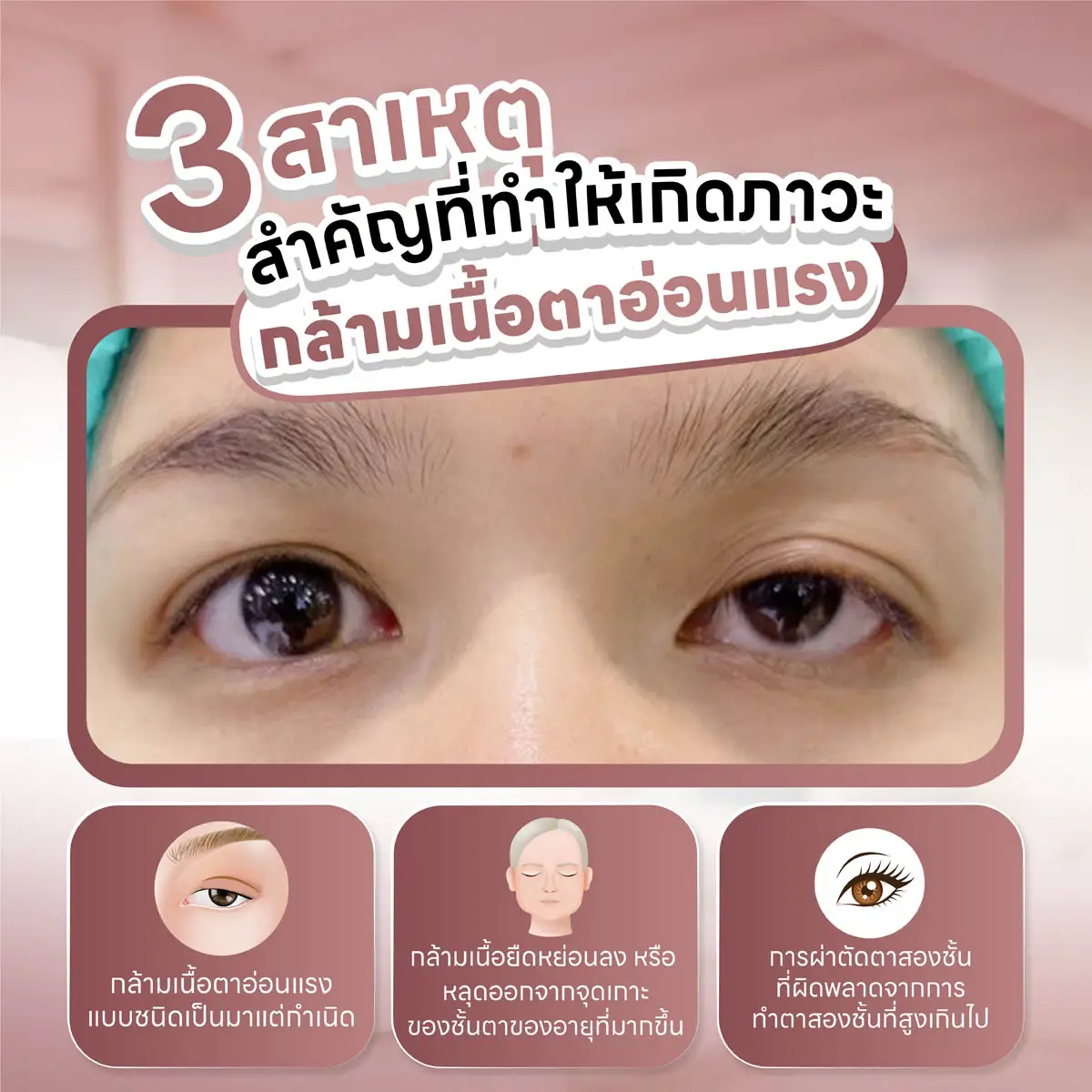 - รักษากล้ามเนื้อตาอ่อนแรง เทคนิคดึงกล้ามเนื้อเปิดตา แบบแผลด้านนอกที่แผลชั้นตาจะทำในเคสที่คนไข้มีภาวะกล้ามเนื้อตาอ่อนแรงตกมาก การผ่าตัดจะลงลึกเข้าไปในชั้นกล้ามเนื้อด้านใน เพื่อให้กล้ามเนื้อเปิดตาทำงานและปรับระดับการยกของกล้ามเนื้อขึ้นให้เป็นปกติ โดยหลังการผ่าตัดกล้ามเนื้อตาอ่อนแรงจะพบอาการบวมช้ำประมาณ 20-30 วัน หรือ 1 เดือน เหมือนการทำผ่าตัดตาสองชั้นตามปกติทั่วไป