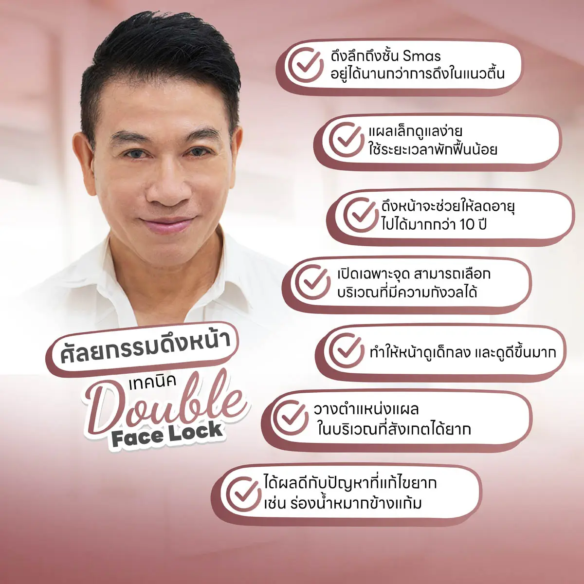 ศัลยกรรมดึงหน้า เทคนิค double face lock เป็นการผ่าตัดดึงยกกระชับกล้ามเนื้อบริเวณใบหน้าและลำคอให้ตึงขึ้น ตักตกแต่งผิวหนังที่หย่อนคล้อยมากๆและไขมันส่วนเกินออก เพื่อแก้ไขปัญหาความหย่อนคล้อยของผิวหนัง ริ้วรอยเหี่ยวย่น รอยตีนกา ร่องแก้ม ร่องน้ำหมาก ถุงใต้ตา ฯ ซึ่งปัญหาความหย่อนคล้อยเหล่านี้เกิดจากโครงสร้างใบหน้าที่ทรุดตัวและเอ็นที่ยึดระหว่างผิวหนังและกระดูกบนใบหน้าเกิดความหย่อนจากอายุที่มากขึ้นเป็นปัจจัยสำคัญ